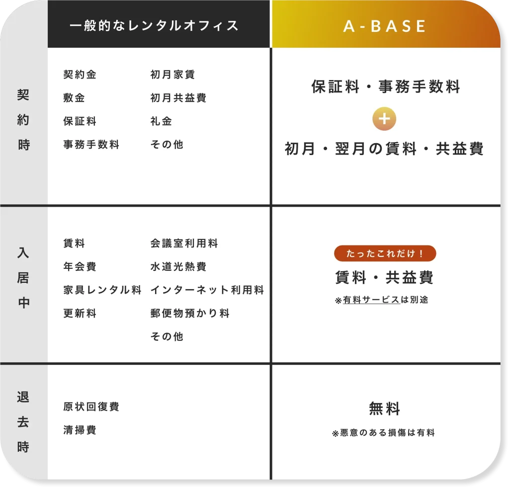 REASON A-BASEが選ばれる5つの理由 駅近でアクセス良好 本厚木駅から徒歩3分の好立地。厚木市中町アドレスで、法人登記が可能です。コンビニ・コインパーキング・飲食店など、徒歩圏内の店舗も充実。共に「厚木」を盛り上げていきましょう! 綺麗な個室 作り付けの広いカウンターデスク、オシャレな床・壁・天井。間接照明がワンランク上のオフィスを演出。居心地の良い空間です。 無料設備が充実 デスク、椅子、インターネット接続、電話機等、充実の設備が標準装備。防犯カメラやインターロックも完備しており、セキュリティも安心。打ち合わせに便利なモニター付き会議室も無料でご利用いただけます。 費用が安い 初期費用は安く、ランニングコストも格安! 水道光熱費は、すべて一律の共益費に含まれており別途ご請求することはありません。 できるだけコストを抑えてご利用いただけるよう基本の設備やサービスが充実しています。 起業時のサポート体制も万全 運営会社である「アーチ・コミュニケーションズ」は、 数多くの新設法人様の起業をサポートしてきた “新規開業のプロ”です。 OA機器、オフィス什器は勿論、各士業と連携し、 開業に必要な事柄全てをサポートいたします。 THE REASON FOR AFFORDABLE 安さの秘密 A-BASEは余計な費用がかかりません。 一般的なレンタルオフィスと比べるとこれだけお得です! →横スクロールしてください